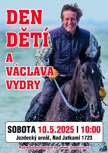 | A K T U A L I T Y  Vážení příznivci koní či obdivovatelé Václava Vydry. Každoročně pro Vás připravujeme akci, při které chceme oslavit krásu koní, poděkovat všem, kdo se celoročně dnem i nocí o tato ušlechtilá zvířata starají a dát do tohoto krásného světa nahlédnout široké veřejnosti. Rádi bychom Vás tímto co nejsrdečněji pozvali do našeho areálu "Na podkově" na Mělníku v ulici Nad jatkami 1723 , tentokrát v sobotu desátého května. Zahajovat budeme v 10.00 Z plakátku je patrné, že naše pozvání přijal opět i Václav Vydra, který patří k našim ale zcela určitě i Vašim nejoblíbenějším hostům. Václav říká: "Zestárli jsme, přijedu se svou mladou kobylkou, co jsem ji u Vás měl i loni. Moc toho neumíme, ale máme se rádi. A něco budu povídat….. a pak nějakou autogramiádu. Dále se můžete těšit: